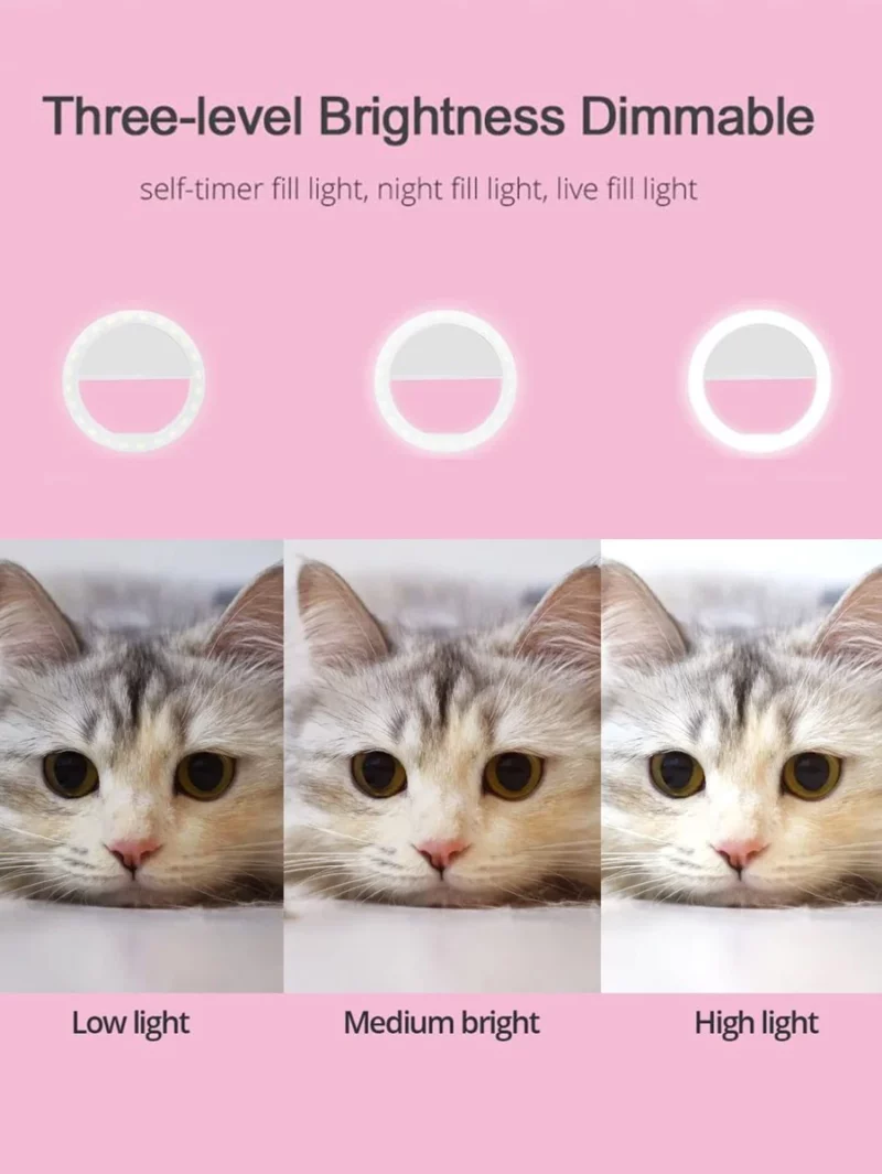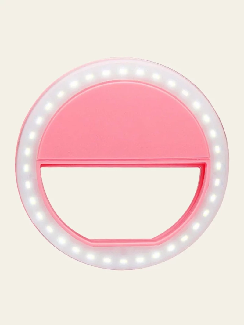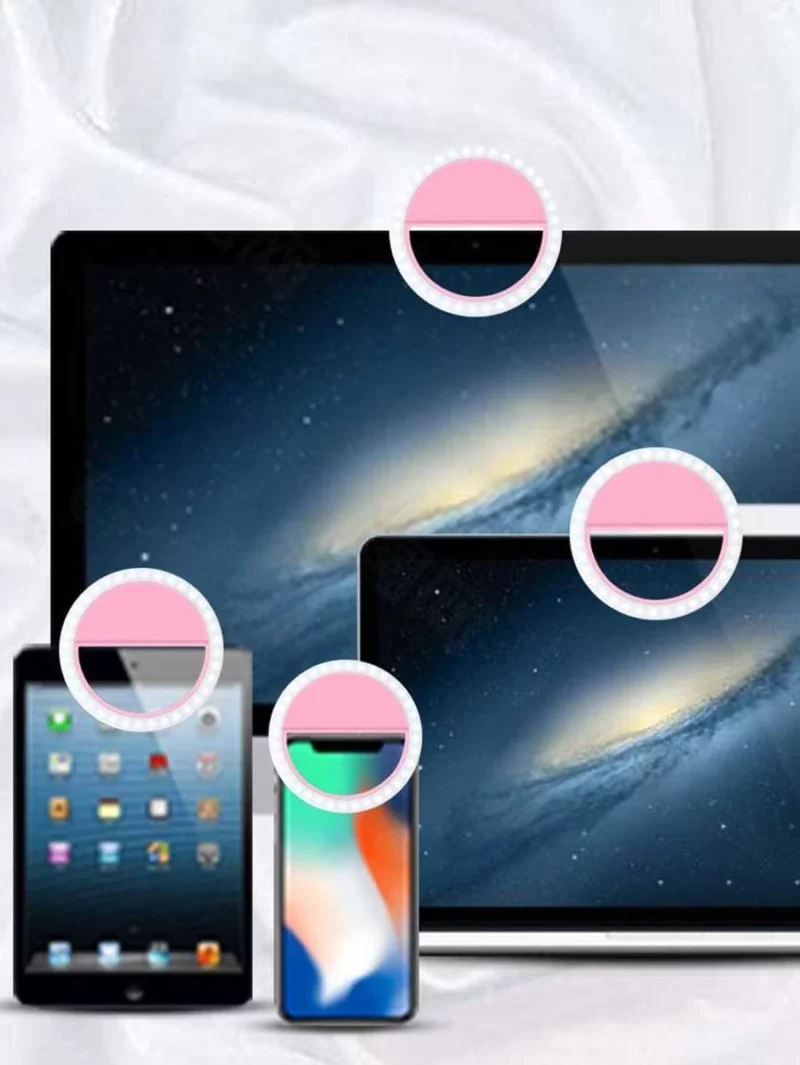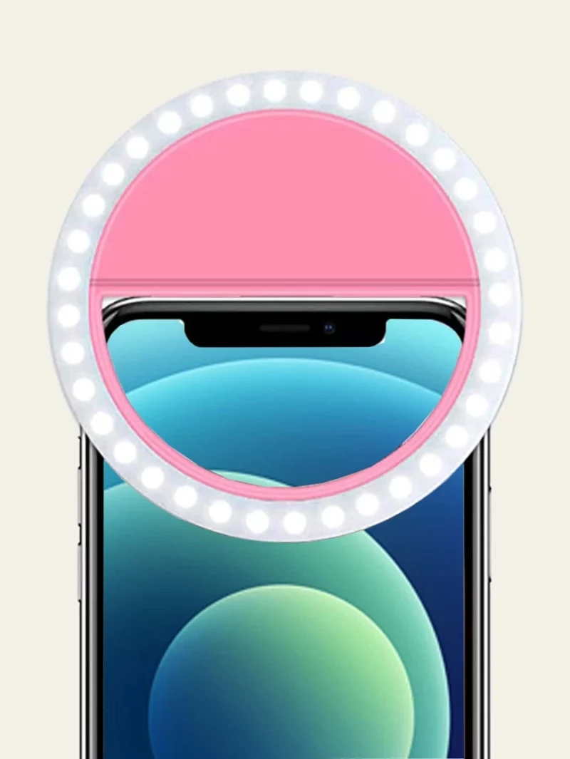 Pequeño aro de luz, fácil de llevar y con clip para sujetar en tu celular o pantallas. Permite sacar mejores selfies y grabaciones más iluminadas.
