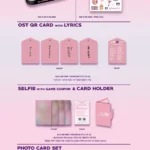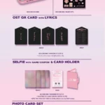– TIN CASE / 130 X 90 X 23 MM– OST QR CARD with LYRICS / 120 X 85 MM / RANDOM 1P (1 OF 4)– SELFIE with GAME COUPON & CARD HOLDER / 54 X 86 MM / RANDOM (1 OF 4)– PHOTO CARD SET / 54 X 86 MM / RANDOM 8P (8 OUT 12)– THE GIRLS STANDEE & KEYRING PENDANTS / ACRYLIC / 120 X 85 MM