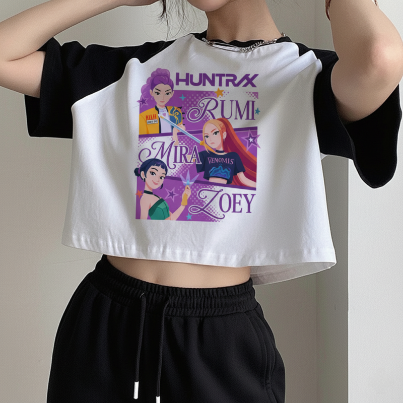 Polera corta blanca con mangas negras diseño Kpop Demon Hunters.