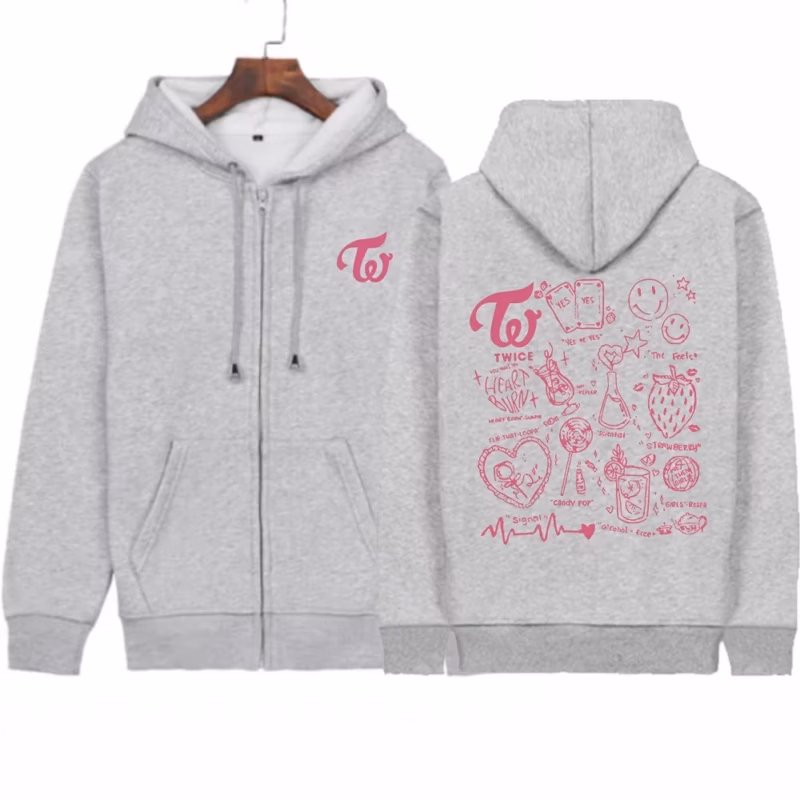 Polerón gris del grupo Twice con novedosos logos. Material algodón, suave y cómoda.