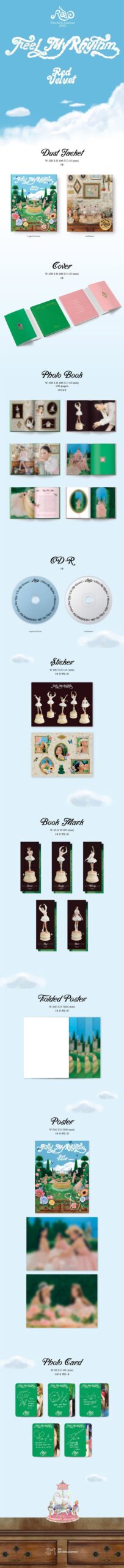 En este nuevo comeback de Red Velvet “Feel my rhythm” cuenta con dos versiones que se llaman Orgel y ReVe. El primero viene en un empaque único para el fandom de reveluv, ya que se transforma como una caja musical con una de las integrantes encima. Asimismo, el CD tiene un tamaño menor a los convencionales. El segundo, llamado ReVe versión es en formato libro. Ambos tienen imágenes exclusivas, stickers, photocard aleatorio y los posters.